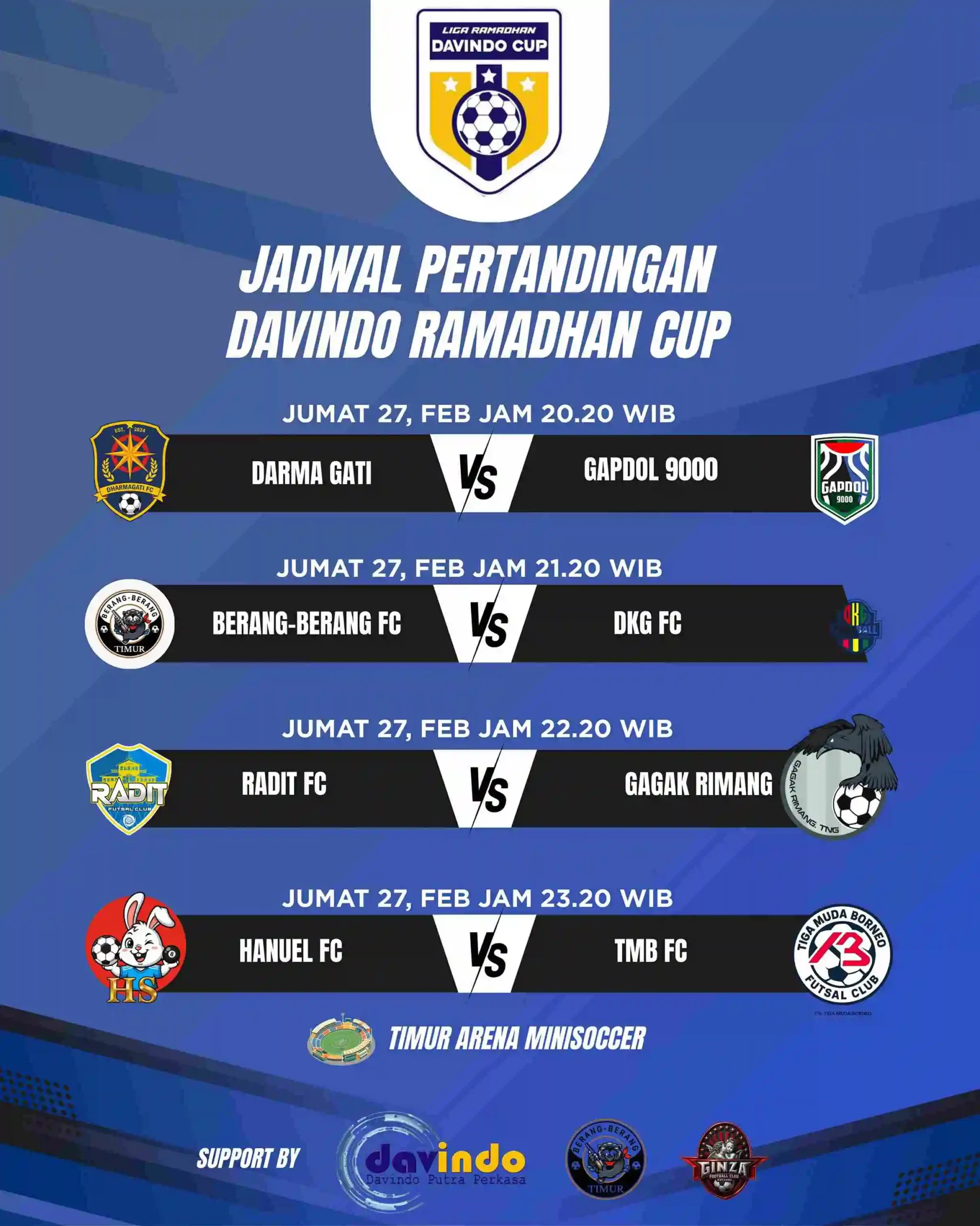 Pontianak – Turnamen mini soccer Liga Ramadhan Davindo Cup resmi menuntaskan babak penyisihan dan kini memasuki fase 16 besar. Atmosfer kompetisi semakin kompetitif seiring mengerucutnya tim-tim terbaik yang lolos ke fase gugur. Ketua pelaksana turnamen sekaligus owner Berang-berang FC, Hery Makhrizal, S.H., M.H., yang akrab disapa Tere, mengapresiasi semangat serta sportivitas para kontestan sepanjang babak penyisihan.